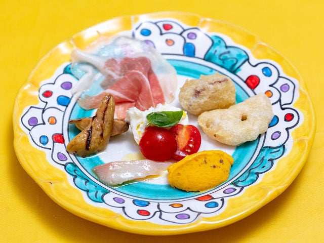 この日は全6種類。上から反時計回りに「パルマ産生ハム」、「白ナスのグリルマリネ」、「シイラのカルパッチョ」、「カボチャの冷前菜」「野菜のフリット2種」そして、中央が「ブッラータチーズのカプレーゼ」。
