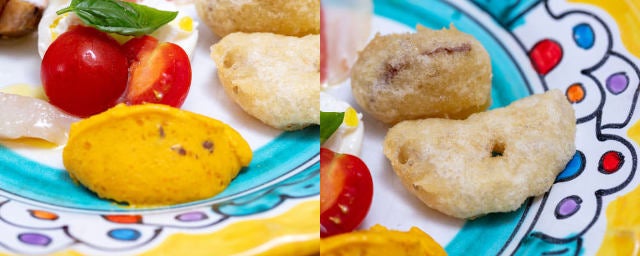 前菜でも紹介したナポリ風の衣を付けて揚げている。タラは身がふんわりやわらかく、品の良い甘みが魅力。天ぷらよりも軽いサックサク食感の衣が、風味をより際立たせてくれる。