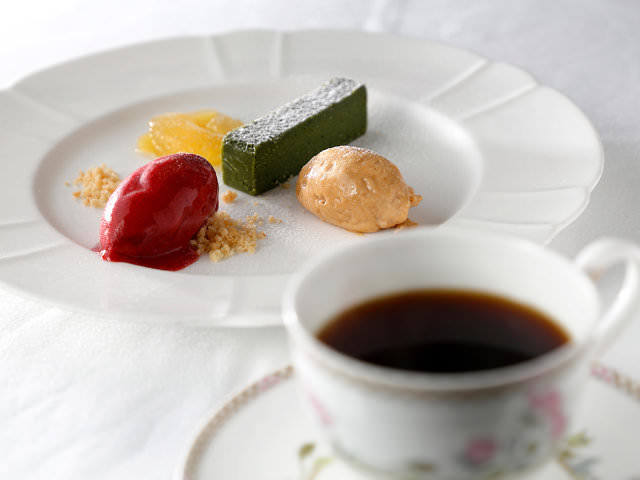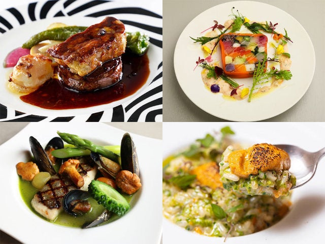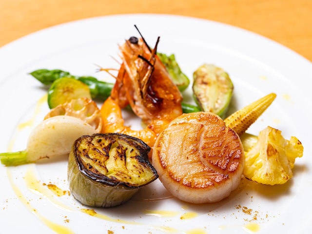 たとえば、スペシャルコースの中のオードブル「魚介類とトマトのムース・ジュレのハーモニー」(写真上)は、15時間かけてトマトを濾過して作った透明なジュレの真ん中に、ズッキーニ、トマトのムース、パルメザンチーズ、新鮮なウニが鎮座する一皿。周囲に散りばめられているハーブ類は、福岡県の『久保田農園』から取り寄せたもので、崩すのがもったいなく感じられるほどのアーティスティックな料理だ。