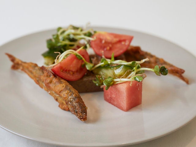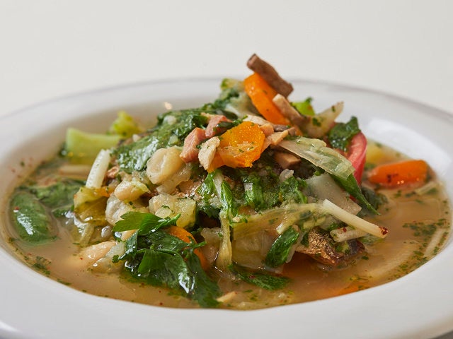 そのひとつが、根菜を中心にさまざまな野菜を煮込んだ具だくさんのスープ(写真上)。根菜を中心に、セロリ、マッシュルーム、白インゲン豆、ニンニクなど野菜がもりだくさん。スプーンですくいながら食べ進めると、野菜の下から、軽くソテーしたイワシが顔を出すところもおもしろい。