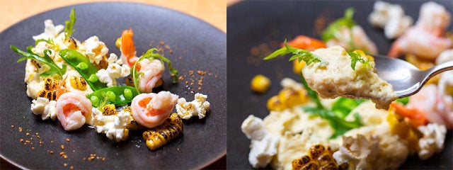 そのひとつ旬の前菜メニュー「朝採りトウモロコシのババロア」(写真上)は、クリーム状にしたトウモロコシとクリームのみで作られており、とろけるような舌触りと凝縮された甘みは誰が食べても「おいしい!」と言うに違いない。