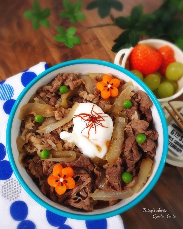 ご飯の上に牛肉の煮物をのせたのっけ弁当の牛丼は、おかずがなくてもそれだけで嬉しいので忙しい時にも簡単な人気レシピ。