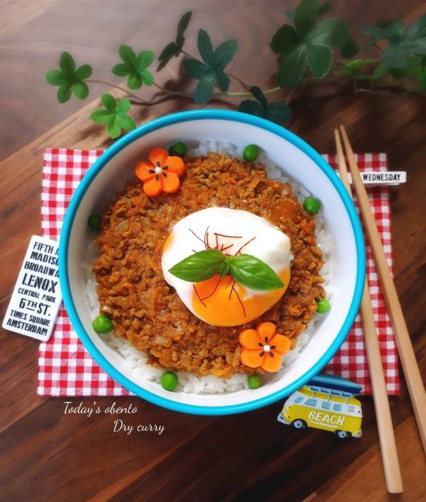 カレーをお弁当でも食べたいならドライカレーのっけ弁当がおすすめ。ドライカレーは煮込む時間が少なくてすむので時短で作れるカレーレシピです。