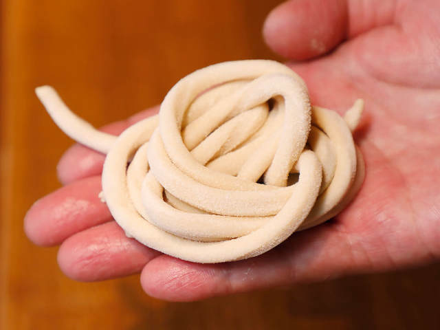 断面が正方形をした卵麺「トンナレッリ」で作ったシンプルなパスタ料理「トンナレッリ カチョ・エ・ペペ」も定番人気だが、「ぜひこれも味わってみてほしい」と作ってくれたのが「ピチ カッレッティエーラ」(写真上)。