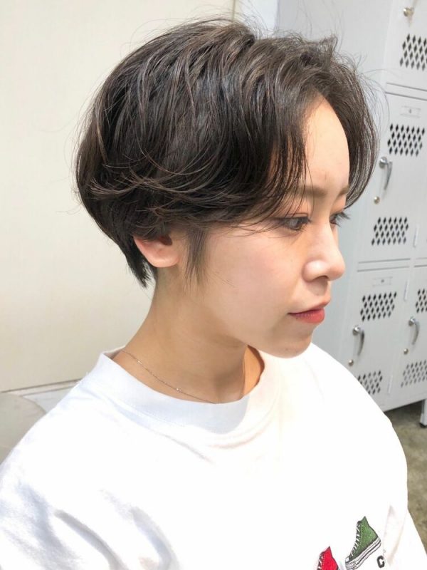 黒髪の重さとパーマのエアリーさで、ちょうどいいバランスのショートヘアに仕上がります。