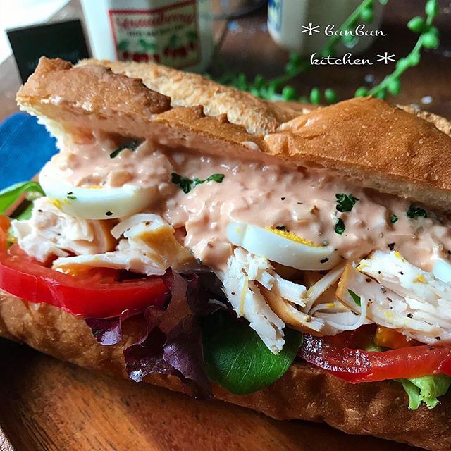 たまにはサンドイッチの種類にバゲットを使うのもおすすめです。自家製のタルタルオーロラソースをたっぷり合わせて召し上がってくださいね。