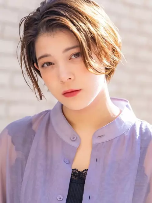 トップにレイヤーとスライドカットを入れたショートスタイルです。後頭部はふわっと丸く、襟足はタイトに。カラーはアッシュ系です。