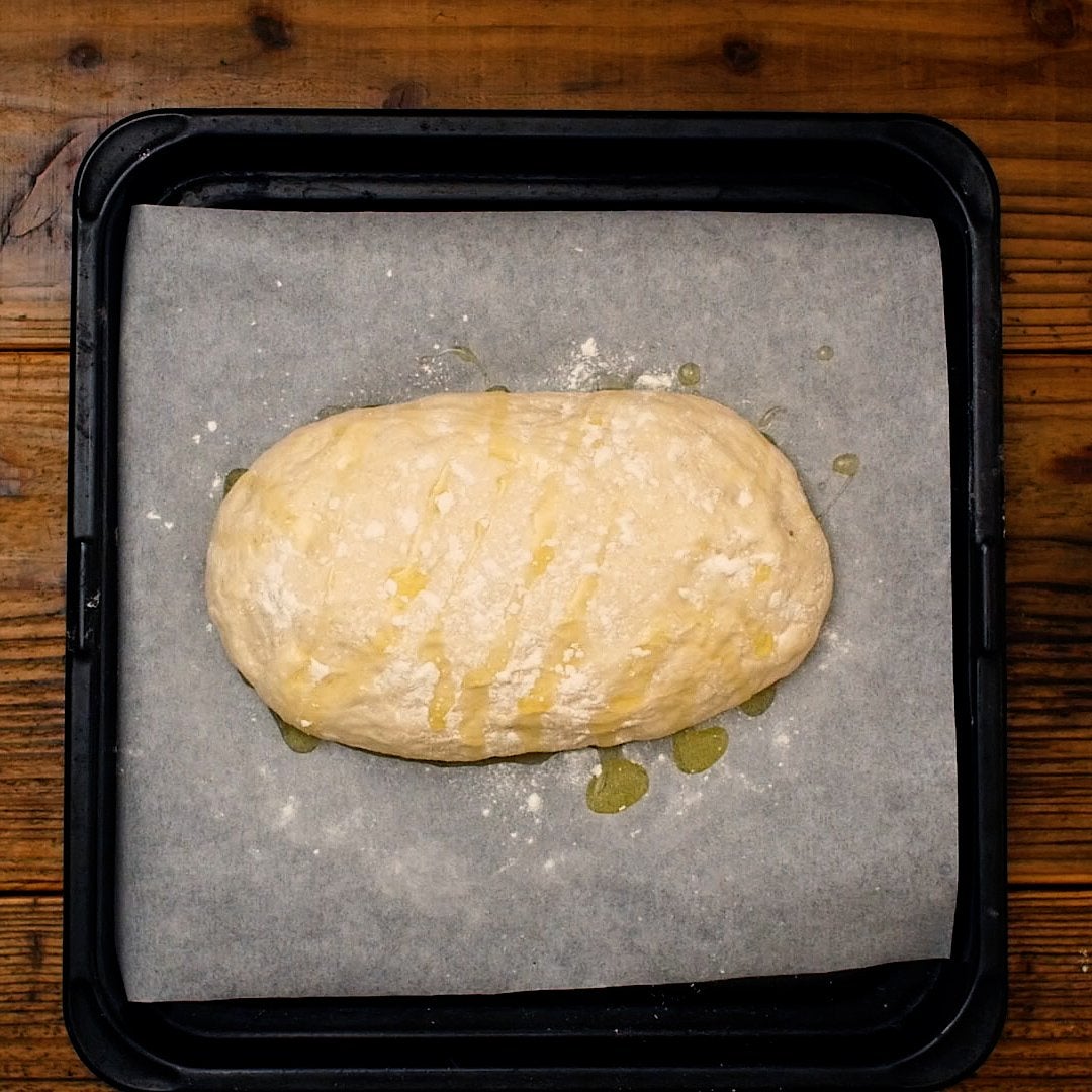 生地の表面に再度強力粉(分量外)をふり、オリーブオイル(分量外)をかけます。