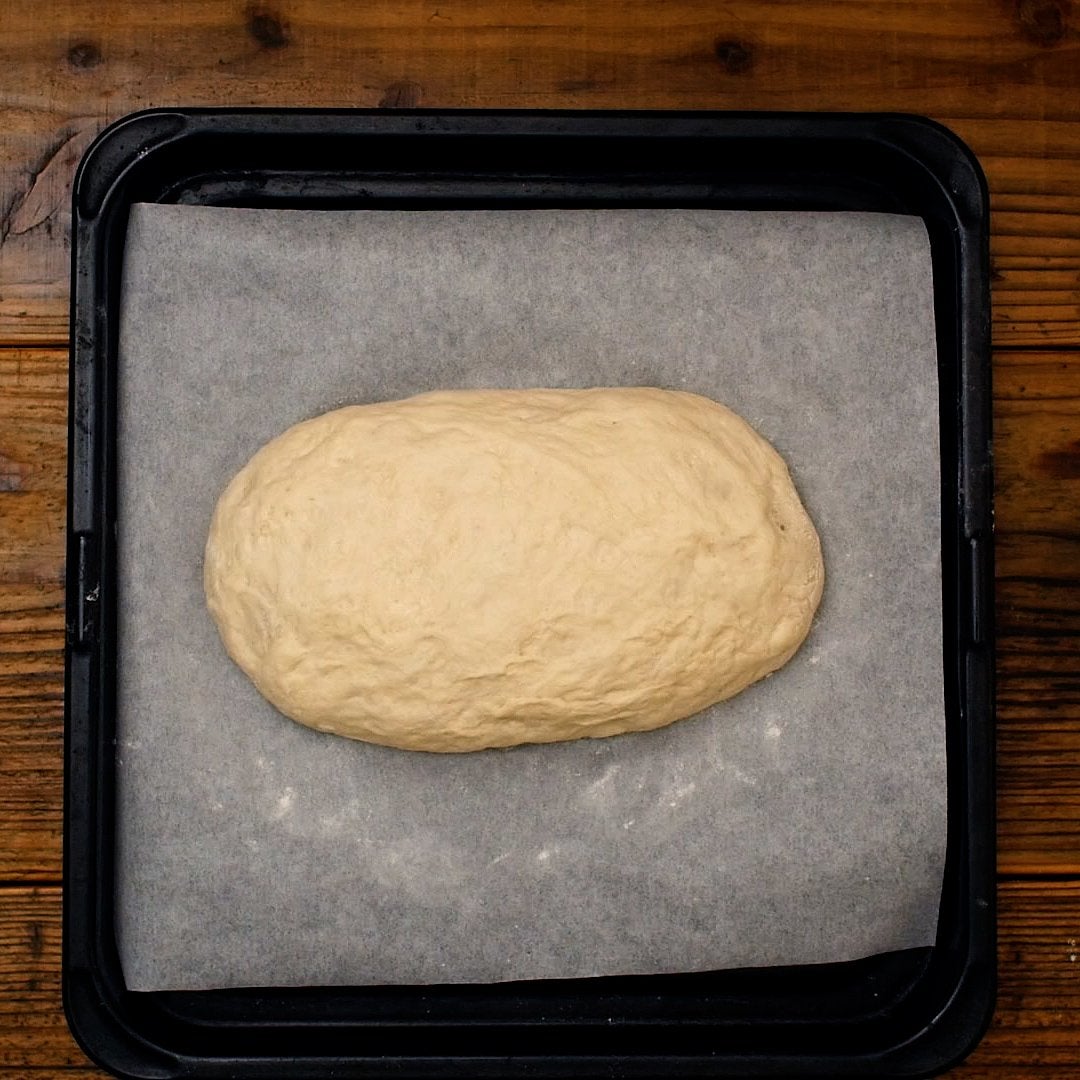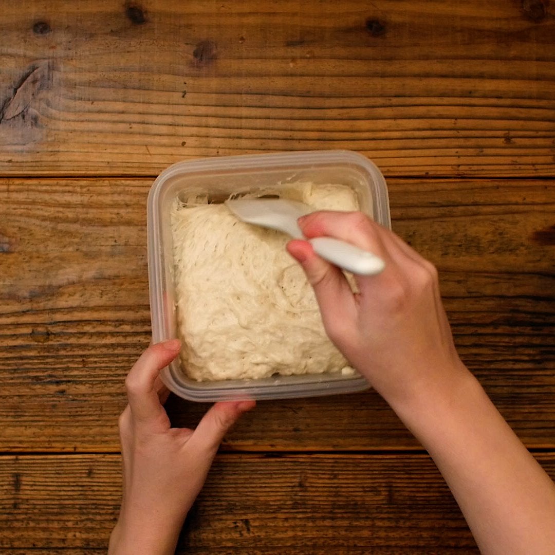 タッパーの中で生地のガスを抜くようにしながら、生地をひとまとめにします。天板にうち粉をして、生地を出します。取り出した生地の上にもうち粉して手で形を整えます。高さのある楕円にしてください。