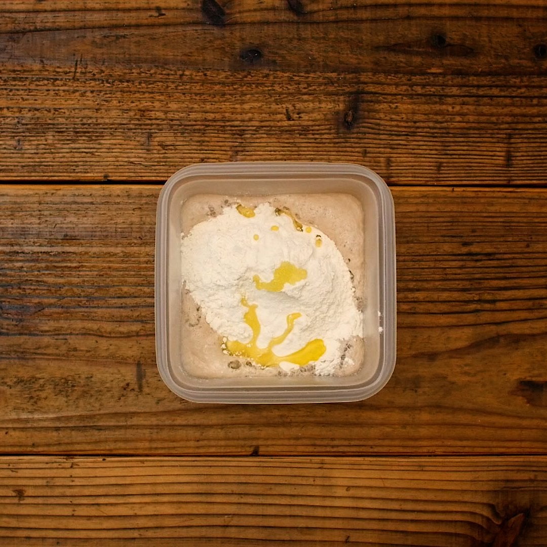 イーストが沈んで少し泡が出ている状態になったら、強力粉、塩、オリーブオイルを加えます。