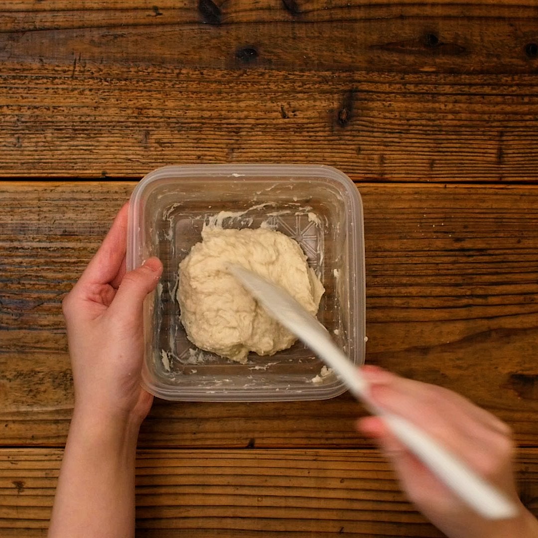 ・本来パンは、小麦粉に水を加えることでできるグルテンを、台の上でしっかりこねることで、さらに強い膜にしていき、発酵させて膨らませます。今回はこねないパンということで、水分量が少し多めで、混ぜやすいですが、こねにくくなっています。水分量が多いことで小麦粉が水分を吸いやすくなります。