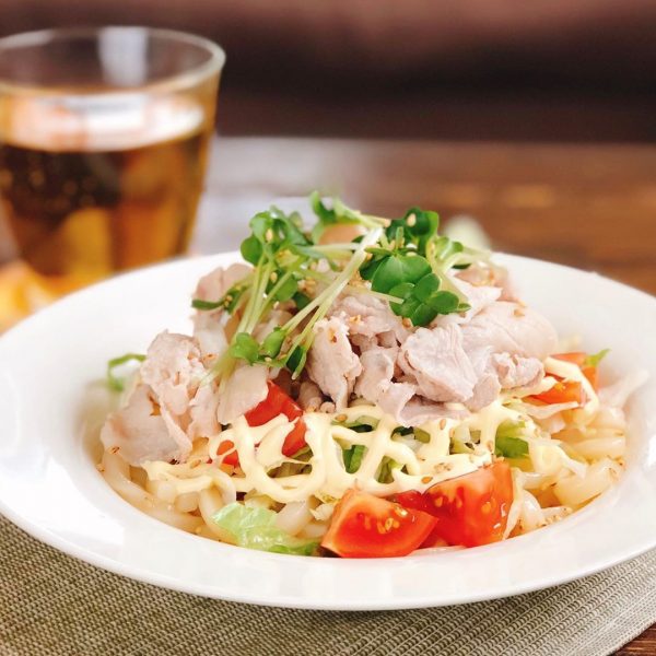薄切りの冷しゃぶをポン酢とごま油のたれとマヨネーズでいただくお腹に優しいうどんレシピを紹介しましょう。