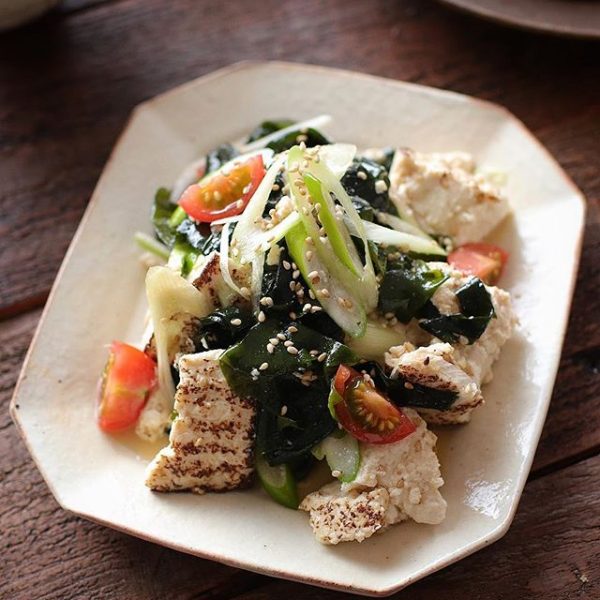 お昼の献立にわかめと焼き豆腐のチョレギ和え