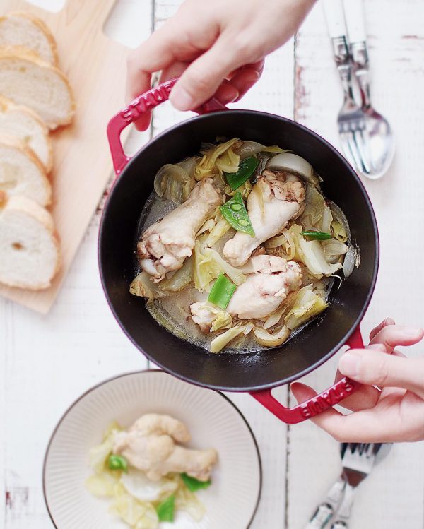 レシピは、キャベツ、かぶ、玉ねぎなど余り野菜と手羽元を鍋に入れ、白ワインと水で10~20分煮込むだけ。