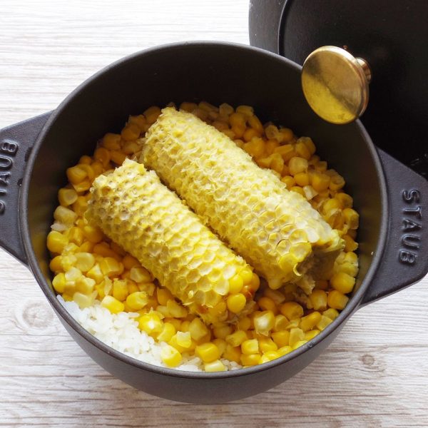 米2合に1本入れると具沢山で美味しいです。とうもろこしは芯からも美味しいだしが出るので、炊く時は一緒に入れましょう。