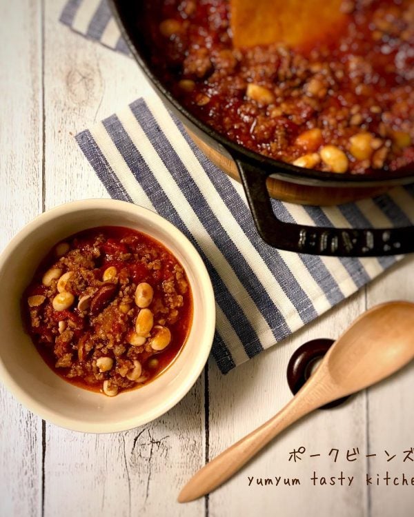 豆と豚肉をじっくりコトコト煮込んで作るポークビーンズは、ストウブの鍋が得意とする煮込み料理でしょう。