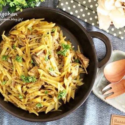 サバ缶の水煮を使用したすぐできる一品です。レシピは千切りしたじゃがいもを炒め、サバ缶を加えて塩胡椒をします。