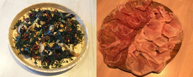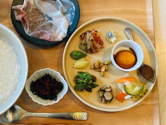 イタリアンらしく、極薄生ハム「クラッタ」を粥が熱い内にのせて食べる。その後は、選び抜かれた薬味が待っている。