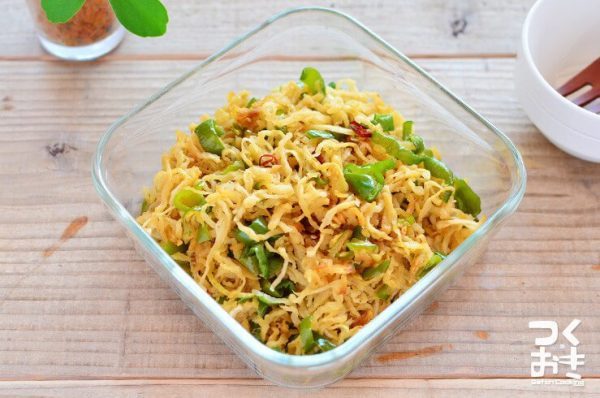 この料理はピーマンや切り干し大根を使った人気のレシピです。ナンプラーの魚介の風味がしっかり効いていて、エスニックなテイストになっています。