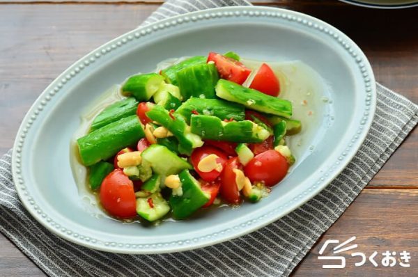 タイ料理にありそうなこのレシピは、ナンプラーとトマト、きゅうりを使った人気の料理です。