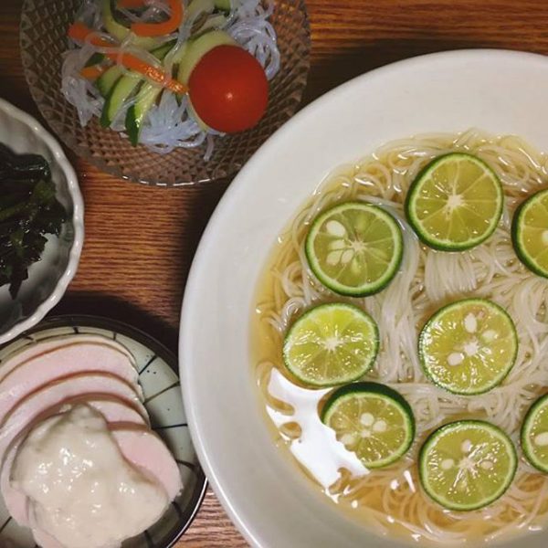 鰹のだしをベースとしたスープに、ナンプラーを使ったアジアン風の素麺はいかがですか?すだちをたっぷりと入れて香りをよくしています。