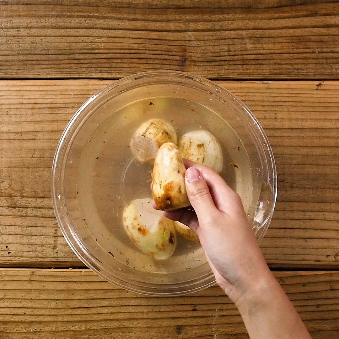 里芋は根元の堅い部分を切り落とし、ナイフで皮をこそぎおとします。全部むけたらきれいに洗い、水けをきります。