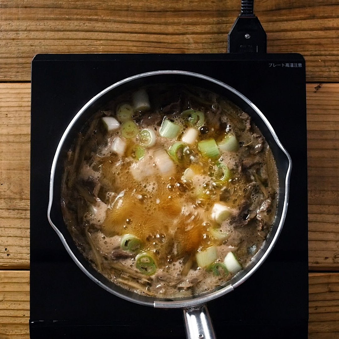 牛肉を入れて、灰汁を取り、火が通ったらしょうゆを加えます。