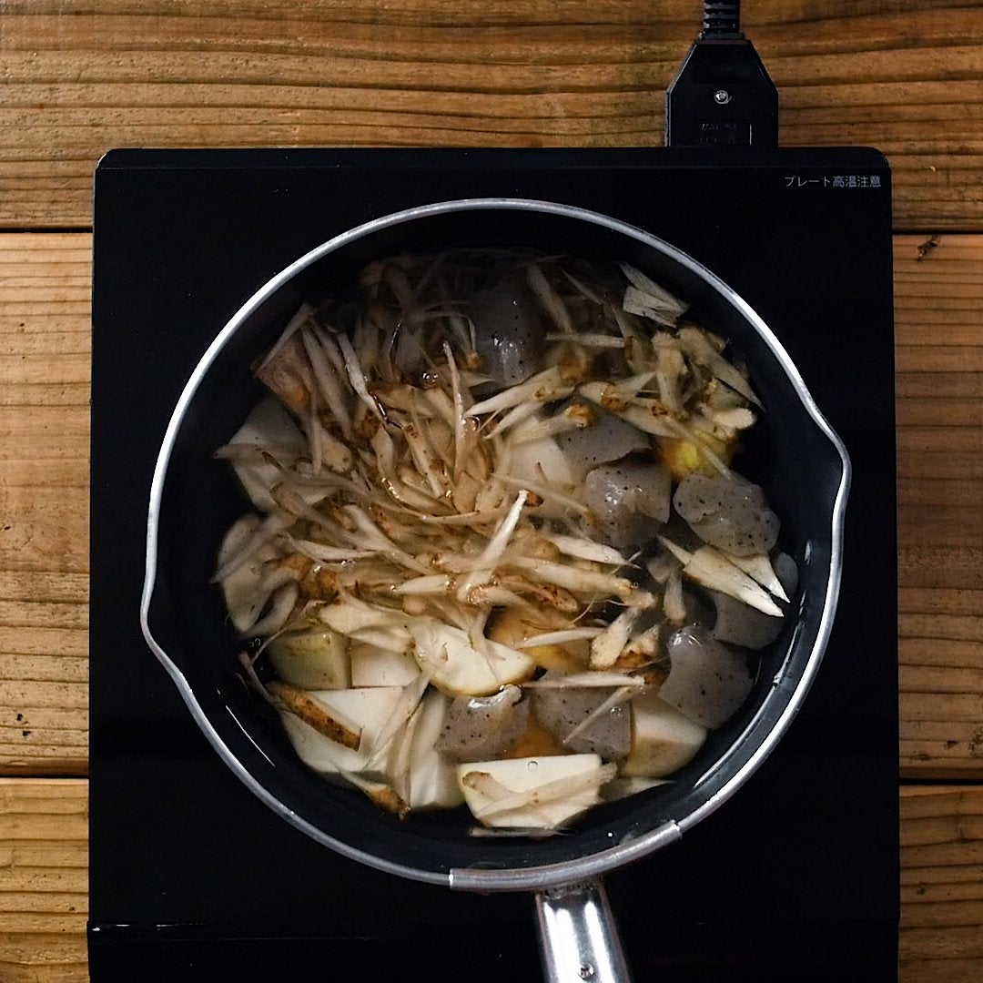 水を鍋に入れ、さといも、こんにゃく、酒、砂糖を入れて、さといもが柔らかくなるまで弱火で10分ほど煮ます。
