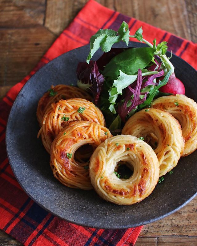 甘くない材料で!スパゲッティドーナツ