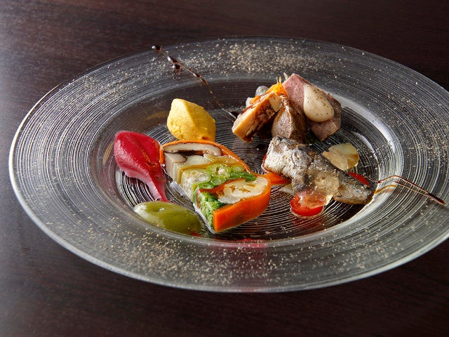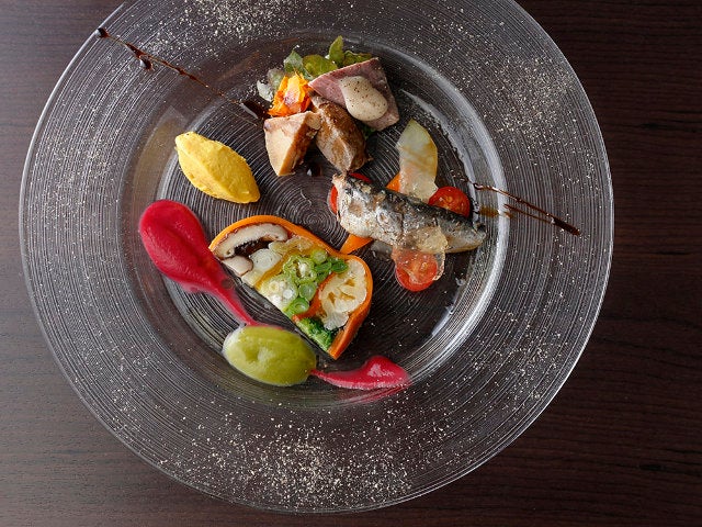 「Satolloコース」一品目に登場する「前菜の盛り合わせ」(写真上)は、彩り豊かで滋味豊富。食感の異なるさまざまな野菜を豚と牛のコンソメでゼリー寄せにした「野菜のテリーヌ」の横には、ビーツとセロリの鮮やかなピューレ。「鳴門産イワシのコンフィ」の下には、千葉県『眞嶋農園』のパパイヤのピクルスをはじめとするとりどりの野菜が敷かれ、栄養バランスも満点だ。
