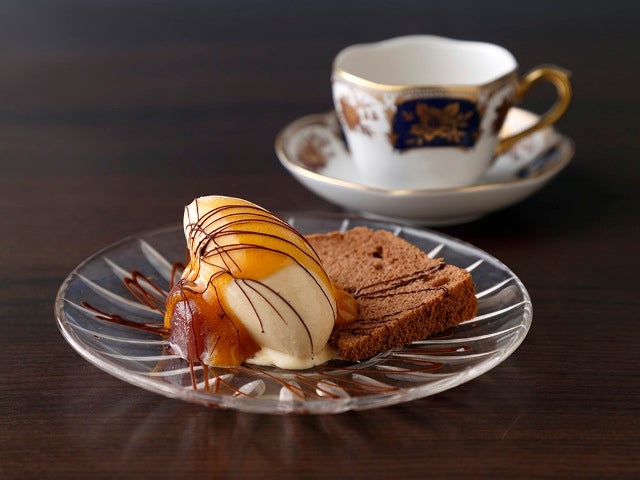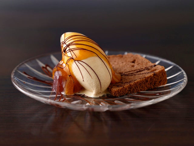 デザートからは、シフォンケーキとアイスクリームのコンビネーションプレート(写真上)をご紹介。ココアパウダーとシナモンを練り込んだケーキは、甘さ控えめでふんわりした食感。バナナ風味のアイスには、砂糖でマリネしてピューレされた柿がとろりとかけられている。アイスの下に潜んでいるのは、赤ワインでコンポートしたやわらかなりんご。果実味やクリーミーさ、シナモンの苦みなどさまざまな味わいに満ちた一皿は、エスプレッソと相性抜群だ。