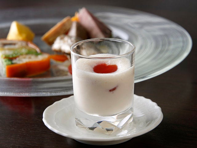 ちなみに、5,000円コースは一品目が前菜だが、7,000円コースの場合はその前にほっとする味わいの「スープ」(写真上)が供される。こちらの白いスープの正体はピュアホワイト。真ん中にトッピングされているのはスッキリとした味わいのガスパチョだ。
