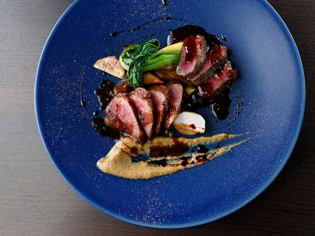 添えられているマッシュポテトには“インカのめざめ”を使用してスモークをかけているため、コク深い赤ワインとも好相性。肉の下に敷かれているレンズ豆と栗豆は北海道『村上農場』のもの。ネギを焦がして仕立てたピューレは香ばしく、一皿を通して五感がいっぱいに震わされる。
