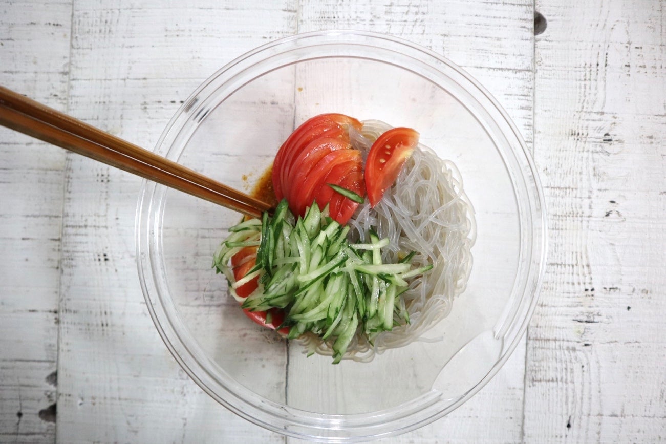 方法はとっても簡単!春雨をかぶるくらいの水に浸してレンジで加熱するだけです。レンジ任せで春雨を戻せるので、その間に具材を切ったり、ドレッシングを混ぜて準備しておき、あとは全て和えるだけで完成しちゃいます。