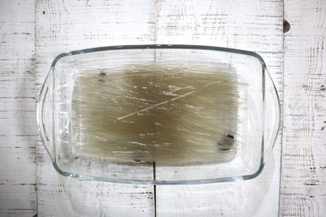 ① 春雨を耐熱容器に入れて水をかぶるくらい注ぎ、ふんわりラップをかけて、600wのレンジで8分加熱します。加熱し終わったら流水ですすいで冷まし、水気を切っておきます。