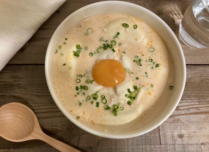 全体的に火が通ったら完成。今回は卵黄ときざみねぎをトッピングしましたが、チーズやごま油と合わせる日もありますよ。物足りなかったら、残ったスープで簡単リゾットを作るのもおすすめです!