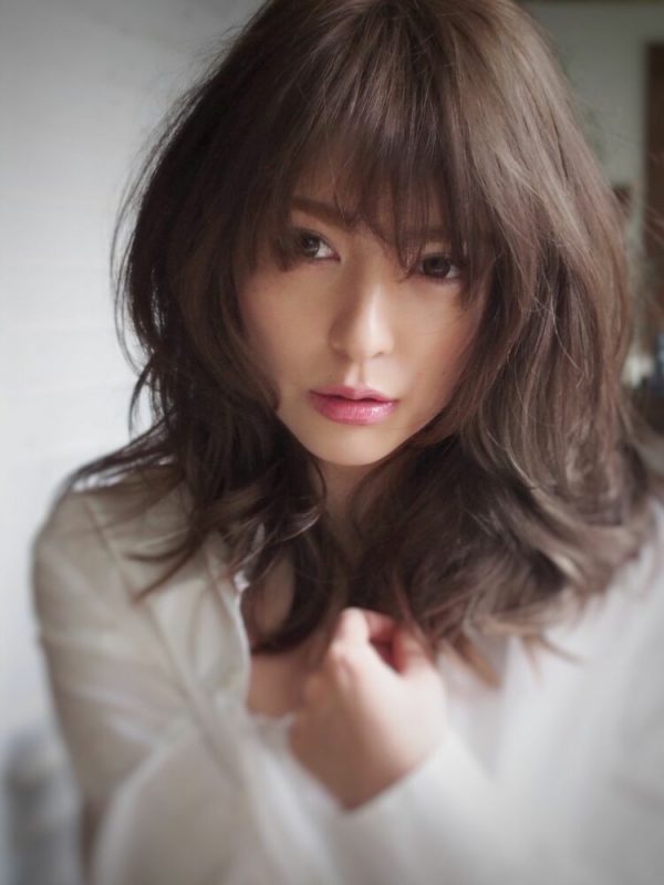 全体的には重ために感じる黒髪セミロングヘアですが顔まわり中心にレイヤーを入れてあるので顔の形がきれいに見えますよ。