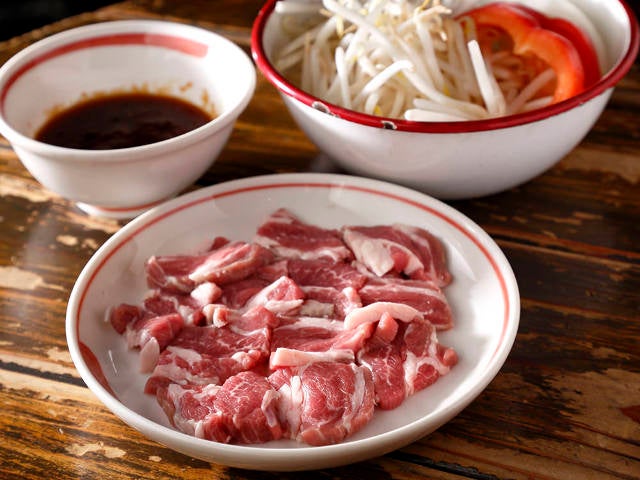 「生ラム肩ロース」「野菜三種盛(もやし、玉ねぎ、パプリカ)」「自家製りんごだれ」がセットになっているので、まずはこちらを注文して、食べたりない場合はそれぞれ追加で注文しよう。