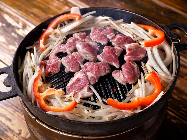 まずはすべての野菜を鍋の上で炒めて、しっかりと火が通ったら鍋の縁に移動させ、真ん中の空きスペースでラムをじゅうじゅうと焼いていく。その間、玉ねぎやもやしをつまみながらお酒を飲み進めてもいいが、全部焼き上がってから一気に掻っ込むのも爽快だ。