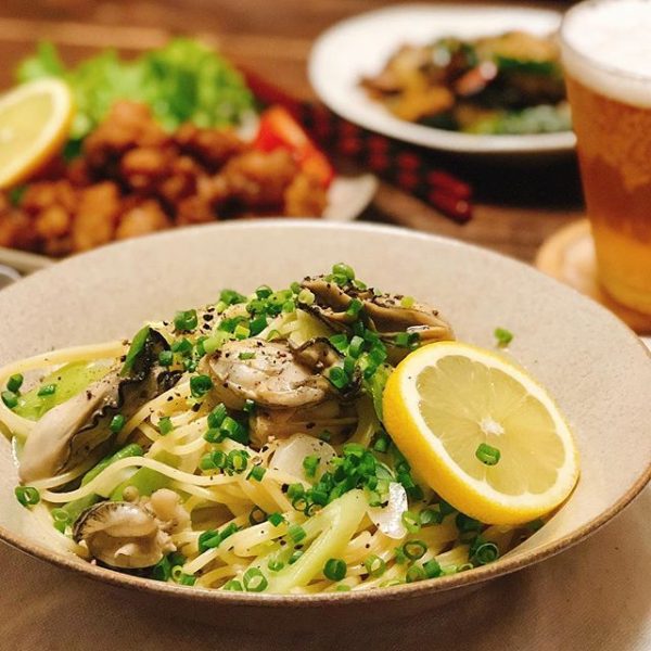 和風の味付けで作るパスタも具材によって種類が豊富で、こちらのように牡蠣など魚介類を合わせることで豪華でおしゃれなメニューに仕上げることができます。