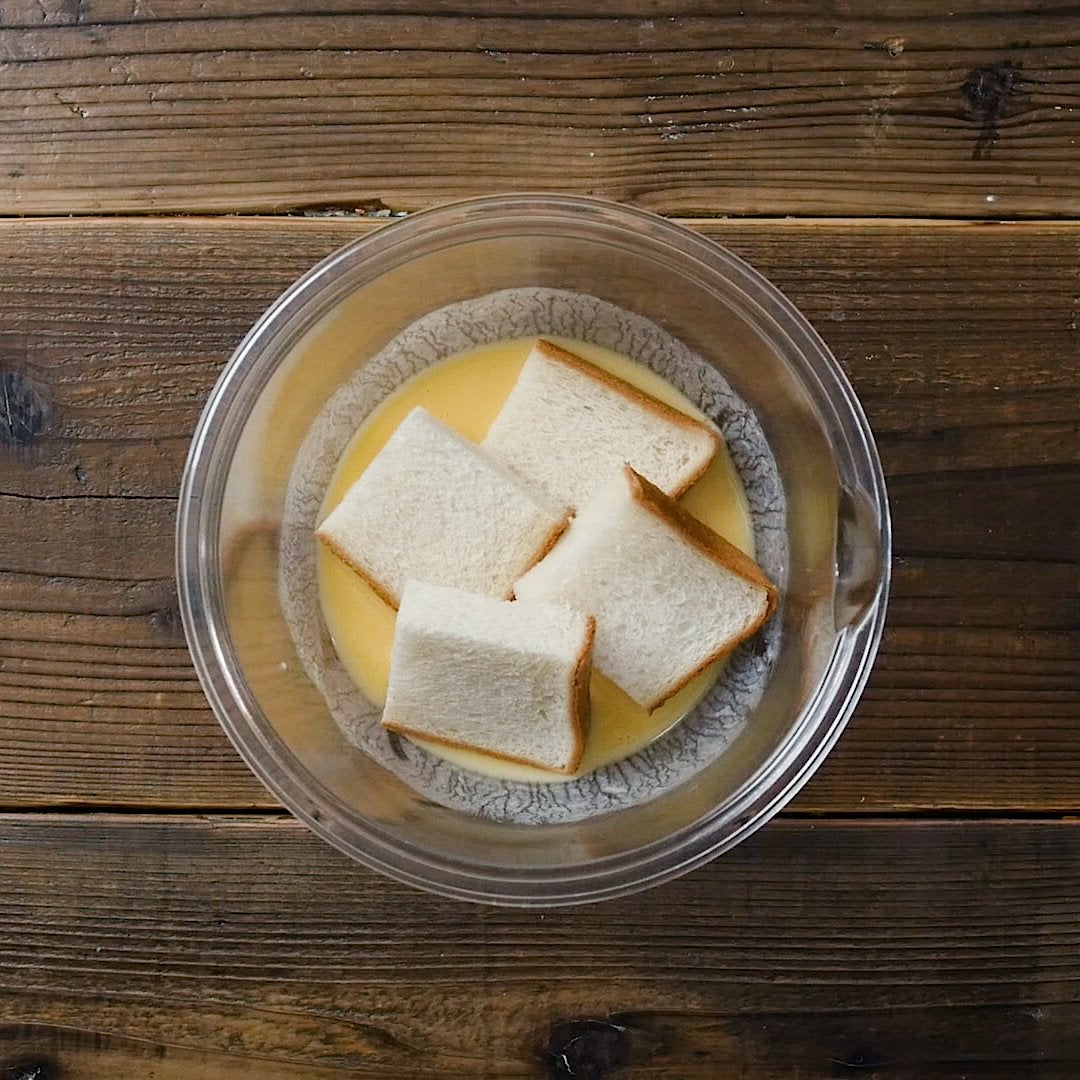 食パンを加え、よく染み込ませます。