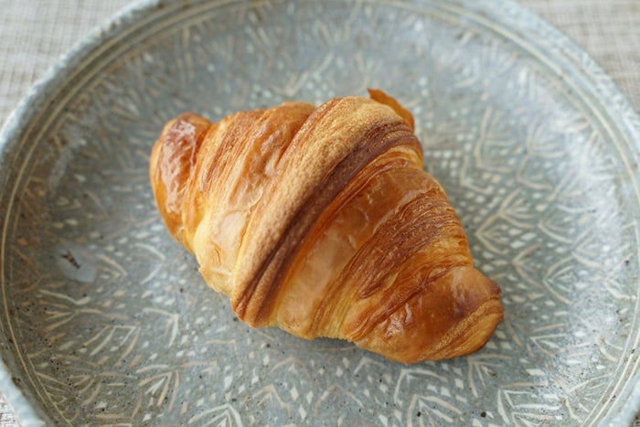 定番人気の食パン「パン・ド・ミー」。通常、食パンの成形は機械でおこなわれますが、「コム・ン」では職人の手で生地ひとつひとつの状態を確かめながら作っていきます。 カリッとした耳に、キメの細かいクラム。湯種を使っているためモチっとした食感です。おすすめの食べ方は、厚切りのトースト。表面がパリッと香ばしく、中が軽い口溶け。このコントラストはクセになりそうです。バターの芳醇な香り「クロワッサンA.O.P」