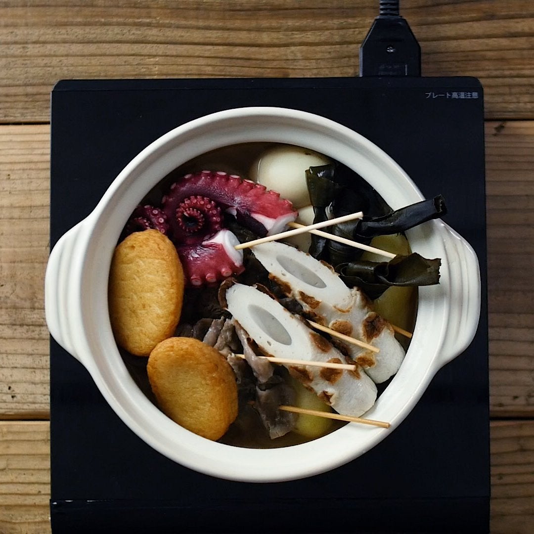 たこ、さつま揚げ、ちくわ、昆布を加え、10分ほど煮込んだら一度火からおろして2~3時間休ませます。