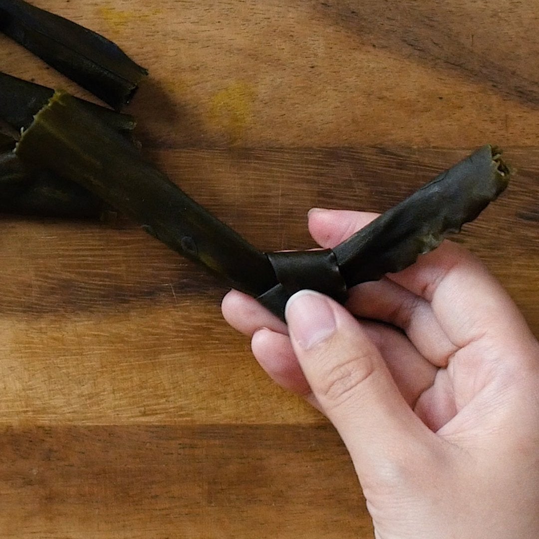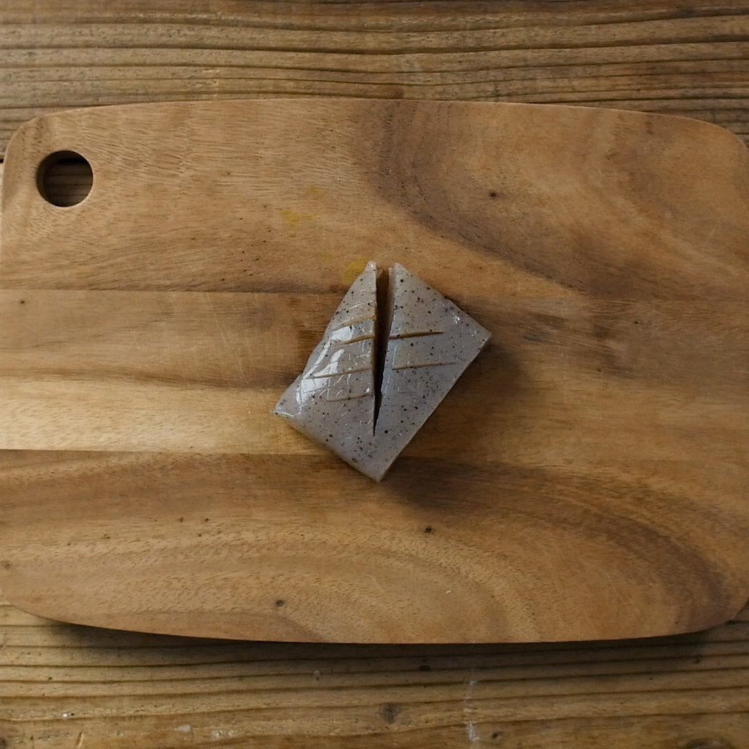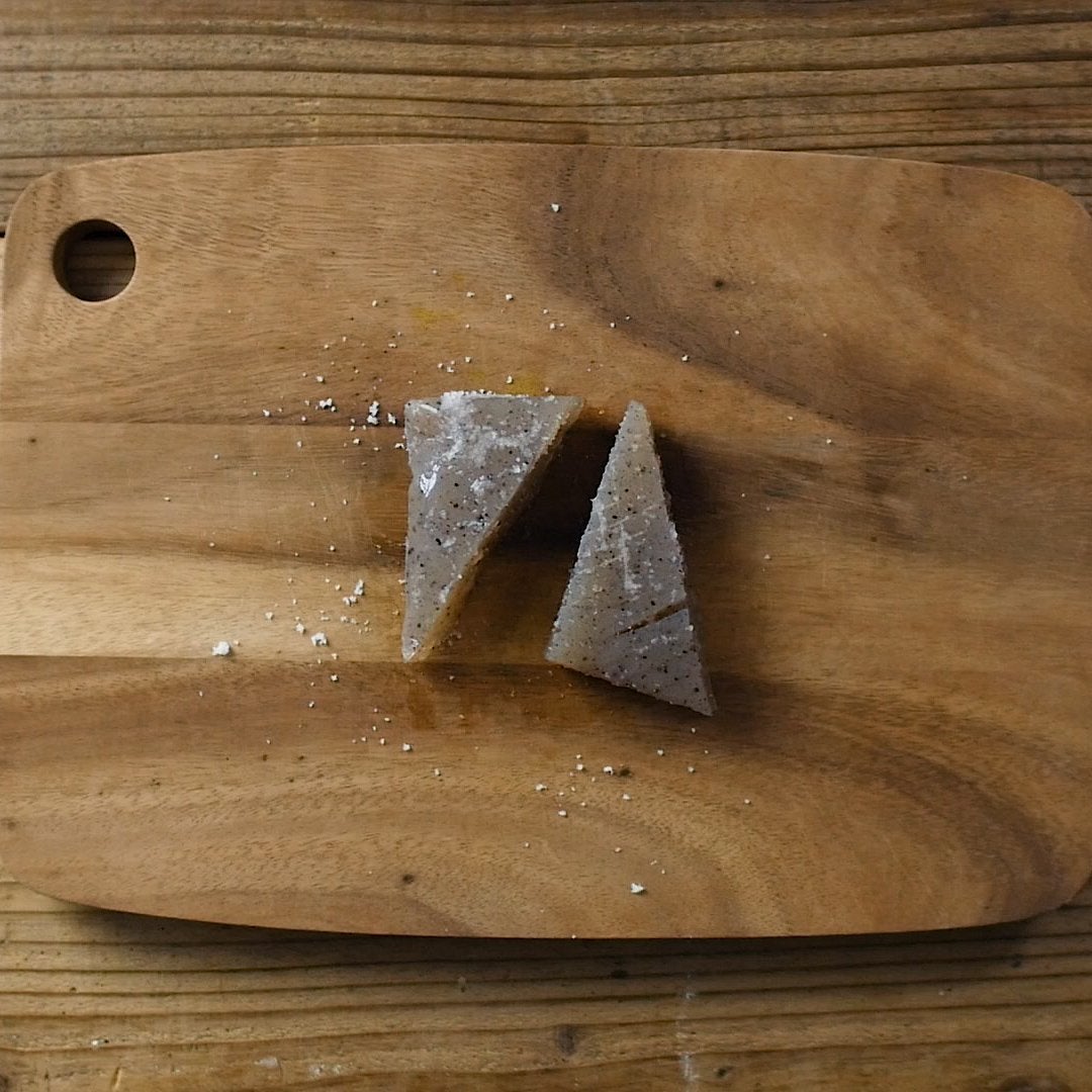こんにゃくは表面に格子状の切り込みを入れて三角に切ります。