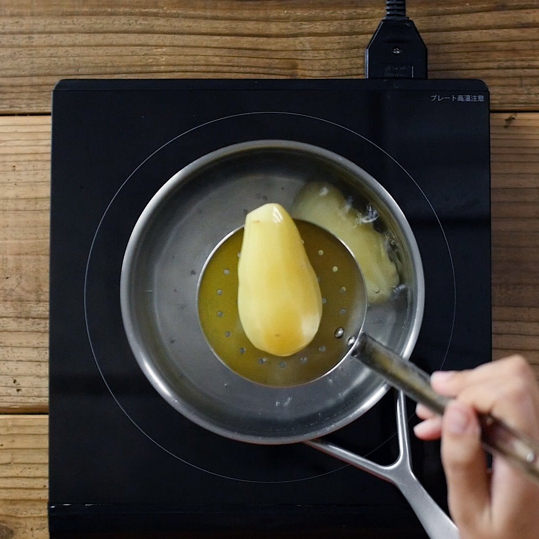 じゃがいもは皮をむき、鍋に入れます。水を加え、沸騰したら中火で5分ほどゆでます。