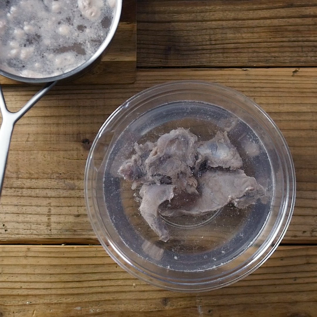 別の鍋にたっぷりの水(分量外)、牛すじを入れて火にかけ、アクが出たら洗い流します。