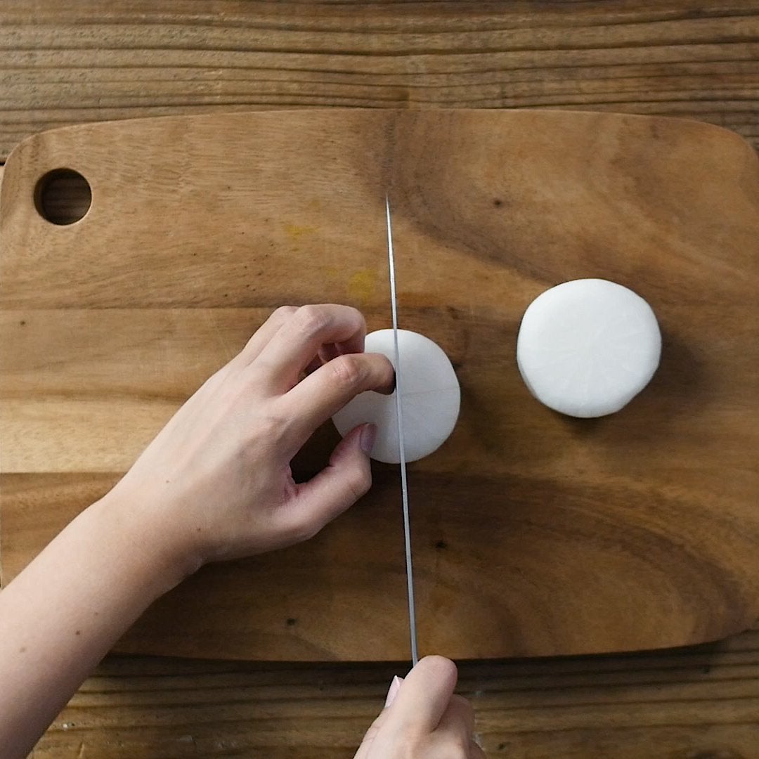 大根は2cm幅に切り、隠し包丁、面取りをします。