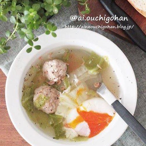 作り方は鍋に水と白だし、みりんを加え、キャベツと肉団子を入れて煮込みます。後は器に注いでアミエビや温玉などをトッピングするだけです。