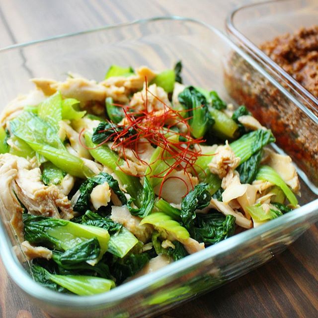 青梗菜とサラダチキンのからし和え