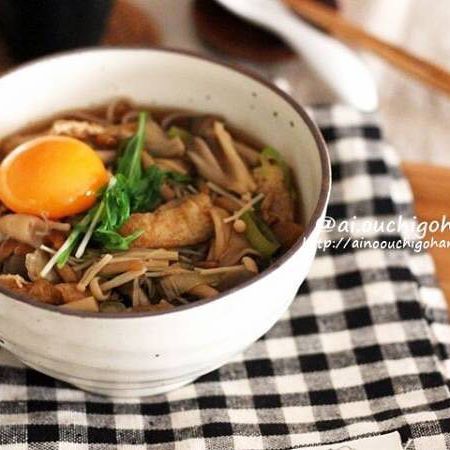 低カロリーなキノコをたっぷり使用した具沢山のそばはいかがでしょうか。夜食にはこのようなレシピがおすすめです。